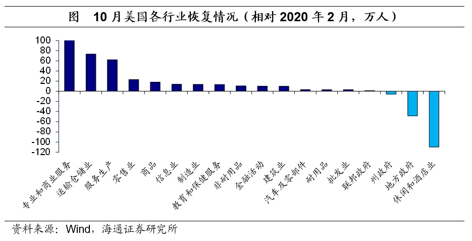 政府和休闲酒店业缺口仍大。从就业恢复来看,相对2020年2月,无论是商品生产还是服务生产均已恢复到疫情前的水平(2020年2月),而政府就业仍有约50万人的缺口。