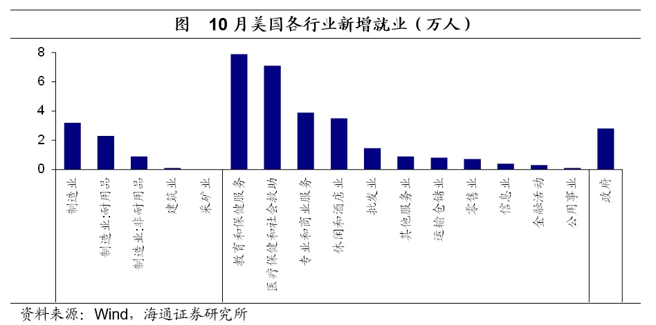 其中,服务业贡献超7成。尤其是教育和保健服务业、专业和商业服务以及休闲和酒店业,三者贡献了接近6成的新增就业。商品生产也贡献了12.6%的新增就业;而政府也贡献了10.7%的新增就业。