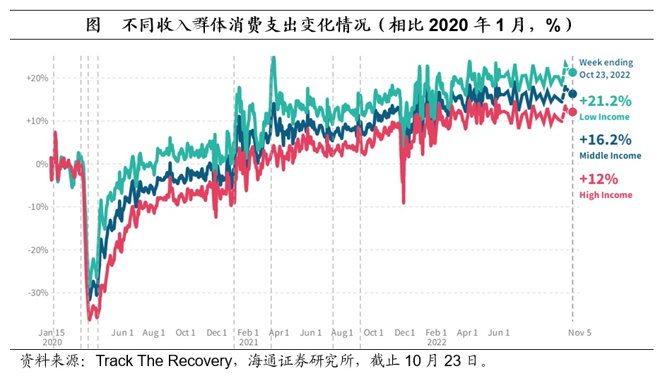 加息终点或更高。美国当前经济增速虽略有回落,但失业率还处于历史低位,就业也依然强劲;且消费也有韧性,例如截至10月23日,高收入群体消费较2020年1月高出12.0%,低收入群体消费则高出21.2%。总的来说,当前美联储的核心矛盾仍是高通胀,而通胀短期或难以有效缓解,我们预计,美联储加息或更久,终点或更高。