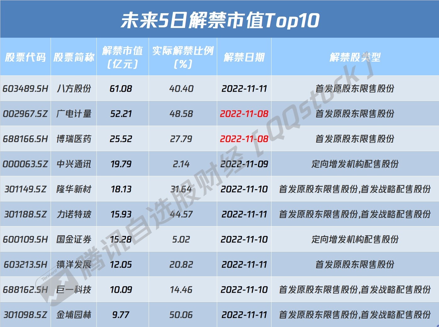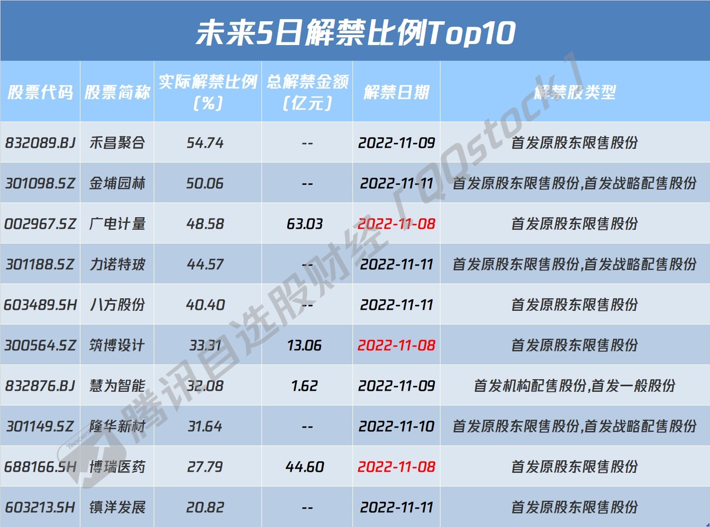 从解禁比例来看,未来5日禾昌聚合解禁比例达54.74%,其次解禁比例居前的分别为金埔园林、广电计量;从解禁市值来看,八方股份、广电计量等股解禁市值居前。