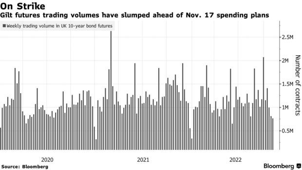 英国国债期货交易量自9月底的近期峰值以来大幅下跌,花旗集团策略师表示,这反映出利率最终走向的不确定性、以及未来几个月英国央行和英国政府债券发行量可能大幅增加。交易员们正在等待政府的预算数据,以便更好地掌握发行情况。