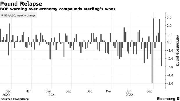 智通财经APP获悉,英国央行对英国经济长期衰退的悲观预测重新引发了对英镑走低的押注。英国正走向2008年以来最糟糕的一年,投资者认为英镑在未来几个月几乎没有上涨空间。包括三菱UFJ金融集团、德意志银行、和荷兰合作银行在内的多家银行预计英镑兑美元汇率在今年年底将再次跌破1.10。