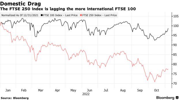 疲软的英镑帮助富时100指数在上周上涨了4%以上,该指数涵盖了面向全球的英国出口商。更专注于英国国内市场的富时250指数在今年的表现一直不及大型股。高盛策略师表示,富时250指数相对于摩根士丹利资本国际全球指数(MSCI World index)的市盈率折让幅度是互联网泡沫破裂以来最大的。他们表示:“鉴于英国经济增长前景疲软、英镑汇率水平和下行风险,这是理所当然的。”