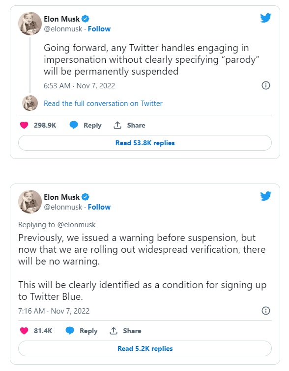 推特的现有的政策已经包含了“恶搞、评论和粉丝账号”的部分。正如马斯克在推特上发布的,该计划将对初犯实施最严厉的惩罚,跳过当前假冒和欺骗身份政策中列出的前两级执行:警告让其进行文件修改与临时暂停帐户直到用户提供个人信息文件。而直接对其进行永久的封禁。