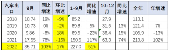 智通财经APP获悉,乘联会秘书长崔东树发文称,2022年1-9月中国汽车的出口市场销量227万台,同比增长51%,主要是海外供给不足和中国车企出口竞争力的大幅增强。近两年的国际疫情下的中国出口增长较大。9月中国汽车出口35.71万台,同比增长103%,表现超强,相对于国内汽车销量9月平淡,出口市场的表现仍是较强的。