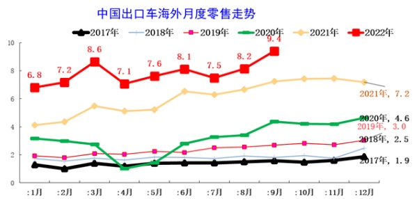 从中国汽车的海外出口零售数据看,月度走势相对平稳,但是在近期呈现较好的增长态势,尤其9月份达到9.4万台的历史新高水平,相对呈现较强增长的态势。目前中国汽车的海外出口零售数据也呈现3月份、6月份和9月份的季度末的强势增长的特征。