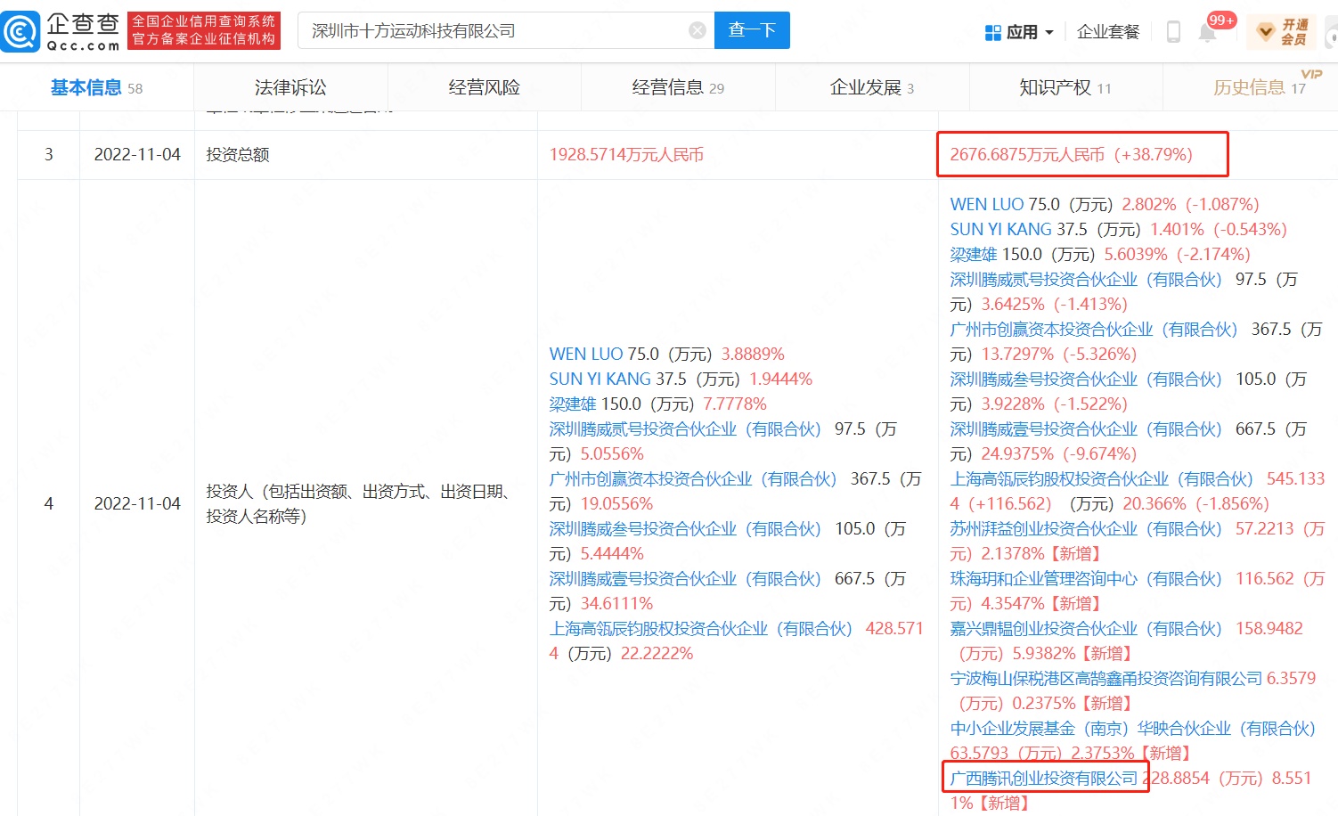 智通财经APP获悉,企查查APP显示,近日,深圳市十方运动科技有限公司发生工商变更,新增股东广西腾讯创业投资有限公司、珠海玥和企业管理咨询中心(有限合伙)等,同时公司注册资本由约1928.57万人民币增至约2676.69万人民币,增幅约38.8%。