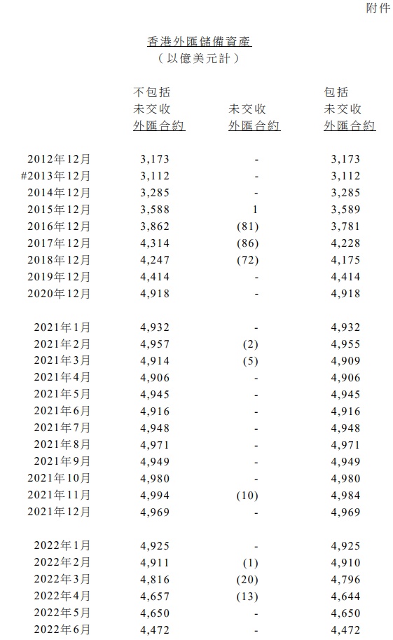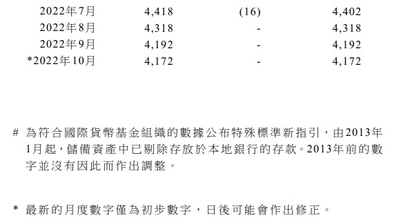 2022年10月底及9月底并无未交收外汇合约。为数4,172亿美元的外汇储备资产总额,相当于香港流通货币5倍多,或港元货币供应M3约41%。