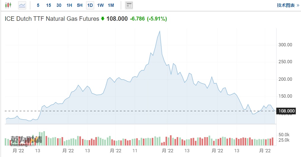 智通财经APP获悉,由于预计未来两周的温和天气将抑制供暖需求,从而缓解历史性能源危机的影响,欧洲天然气价格下跌。数据显示,周一,欧洲基准天然气期货合约价格一度下跌6.8%,至一周多来最低,截至发稿,该期货价格跌5.91%,至108.00欧元/兆瓦时。