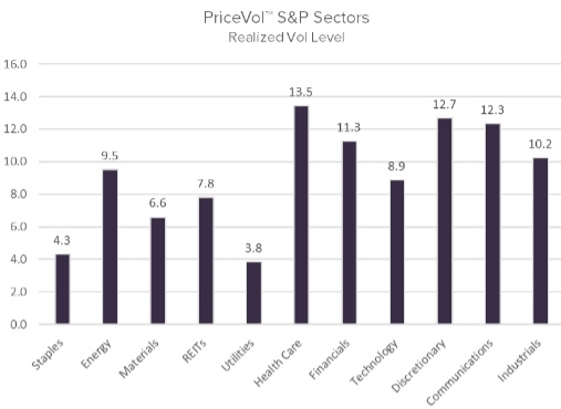 虽然衡量更广泛股票标的的标普500及其对应的ETF(比如SPY和IVV)经历了PriceVol水平大幅上升,但从行业角度来看,有些行业波动性高于标普500指数。