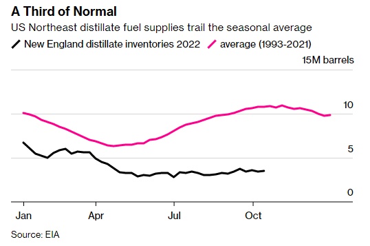 智通财经APP了解到,目前,运送到纽约的取暖油价格达到了历史最高水平。为防止恐慌性抢购,康涅狄格州的零售商开始实行定量配给。新英格兰地区的柴油和取暖油(同一种产品,征税方式不同)库存只有正常水平的三分之一。天然气库存也低于平均水平。马萨诸塞州的一家公用事业公司甚至恳求美国总统拜登准备紧急措施,以防止天然气短缺。