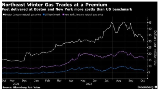 如果天气渐冻,最乐观情况下,美国东北部的消费者将在今年冬季承担几十年来最高的能源账单。目前,迫于在中期选举前控制物价压力的拜登政府正在考虑在新英格兰地区储备更多的柴油和汽油。而在最坏情况下,美国一组经济总量超过日本的州将在维持家庭和企业的照明和供暖方面耗尽所有燃料。