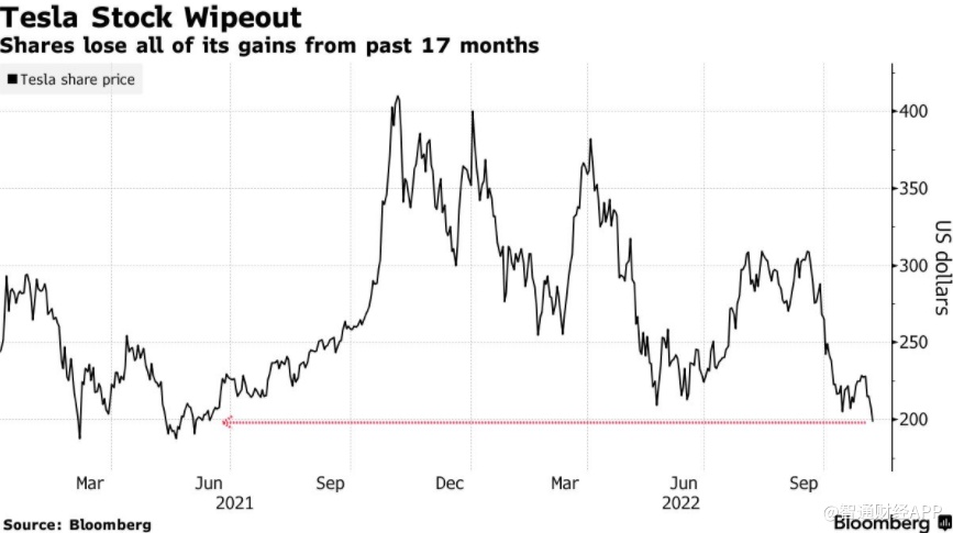 智通财经APP获悉,特斯拉(TSLA.US)抹去了过去17个月的全部涨幅,在首席执行官埃隆·马斯克收购推特公司之后,投资者继续抛售特斯拉股票。特斯拉周一收跌5%,报197.08美元,创下自2021年6月以来的最低水平,成为标普500指数下跌的最大贡献者。