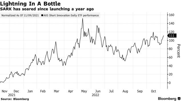 智通财经APP获悉,“木头姐”凯西·伍德的旗舰基金ARK Innovation ETF(ARKK.US)在过去12个月下跌了70%以上,今年押注该基金的投资者付出了巨大代价,而塔特尔资本管理公司推出的反向做空ARKK的AXS Short Innovation Daily ETF(SARK.US)自一年前推出以来涨幅已超过111%,规模达到3.61亿美元,在过去一年推出的近450只ETF中业绩排第二位。