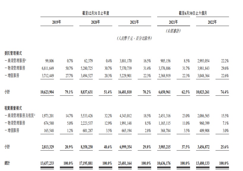 这一波调整导致委托管理模式下来自商业管理服务的收入占比由2020年的0.4%增加至2021年的16.5%,并由截至2021年6月30日止六个月的8.5%增加至截至2022年6月30日止六个月的22.2%。报告期内,委托管理模式下来自运营服务的收入分别为0、0、37.54亿元及29.89亿元,分别占总收入的0、0、16.0%及22.2%。不仅扩大了营收来源,而且减少了项目的亏损额。