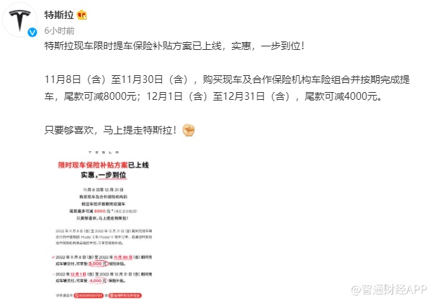 智通财经APP获悉,特斯拉(TSLA.US)周二宣布推出限时提车保险补贴方案,11月8日(含)至11月30日(含),购买现车及合作保险机构车险组合并按期完成提车,尾款可减8000元;12月1日(含)至12月31日(含),尾款可减4000元。值得注意的是,特斯拉在10月24日宣布对在售的国产Model 3及Model Y调价,降价幅度在1.4万-3.7万元不等。