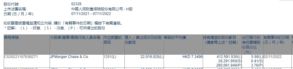 智通财经APP获悉,香港联交所最新资料显示,11月2日,小摩减持中国财险(02328)2201.9028万股,每股作价7.3496港元,总金额约为1.62亿港元。减持后最新持股数目约为4.13亿股,最新持股比例为5.98%。