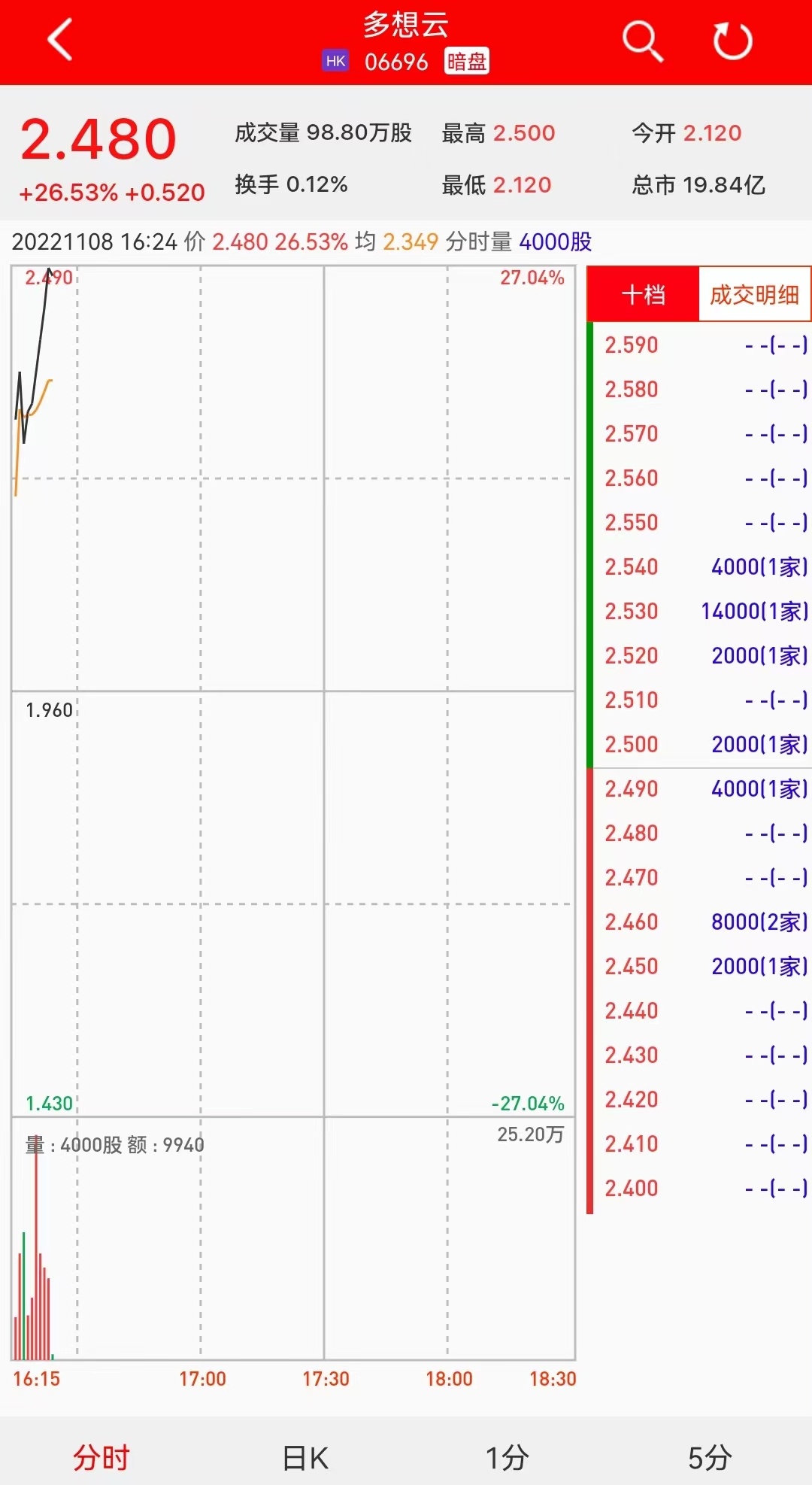 智通财经APP获悉,多想云(06696)将于11月9日(周三)在香港挂牌。截至发稿,利弗莫尔证券暗盘交易显示报价2.480港元,较招股价1.960港元涨26.53%。每手2000股,不计手续费,每手赚1040港元。