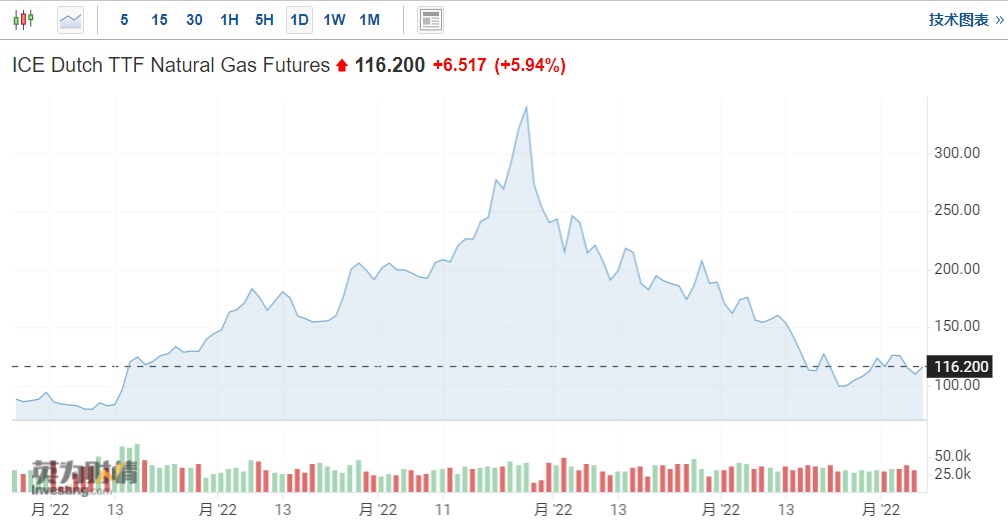 智通财经APP获悉,周二,欧洲天然气价格上涨,原因是欧盟平息能源危机的计划仍存在不确定性。目前,在冬季即将到来之际,这场能源危机已经威胁到欧盟各国经济。数据显示,在连续三个交易日下跌后,欧洲基准天然气期货合约价格周二上涨5.94%,至116.20欧元/兆瓦时。