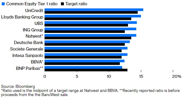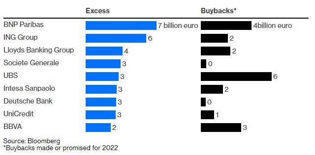 劳埃德(LYG.US)和意大利联合信贷银行(UniCredit SpA)也有多余的资金用于回购,收益率可能超过10%。与此同时,法兴银行(Societe Generale SA)甚至德意志银行(DB.US)都拥有相当于市值15%左右的闲置资金。不过,这两家银行的回购潜力可能会受到监管机构更高的资本金要求或为未来增长进行投资的需求的限制。
