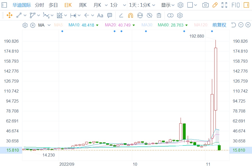 值得一提的是,华迪国际暴跌之前还曾录得“4天暴涨超700%”的战绩——智通财经APP了解到,11月1日至4日,华迪国际股价连续大涨,分别上涨15.59%、21.27%、242.80%、70.26%,4个交易日股价累涨约718.18%,并于上周五股价到达180美元。