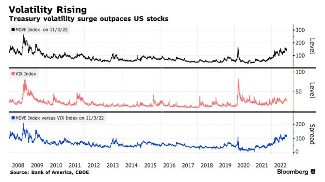 但事实上,在这个过程中,他们只是在火上浇油。目前,一项衡量利率波动率的指标已经接近全球金融危机以来的最高水平,超过了股市和汇市的剧烈波动。至少,这增加了债券交易员的风险,增加了他们在市场中快速获利或蒙受损失的机会。一年来,美联储最激进的加息令债市遭受重创。
