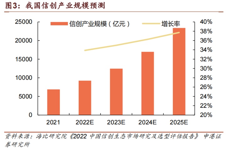国际形势日趋紧张的背景下,国家提出到 2027 年央企国企100%完成信创替代的任务目标,激活了大量的国产信创需求。根据海比研究院数据,我国信创产业2021年的规模约为6886.3亿元,未来几年将保持35%左右的增长,预计信创产业市场规模将在2023年突破万亿,将在2025年突破两万亿。