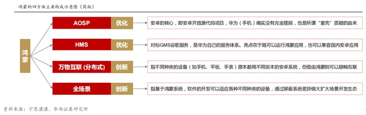 很多投资者将鸿蒙理解为一款类似于安卓的手机操作系统,但实际上,鸿蒙除拥有类似于安卓的AOSP和对标GMS的HMS外,还具备更加广阔的“开源”生态,国内信创精英均可参与到鸿蒙生态的研发之中。在鸿蒙生态的定位中,智能手机为核心枢纽,而其他运行鸿蒙系统的硬件产品则相当于不断扩充的边界。