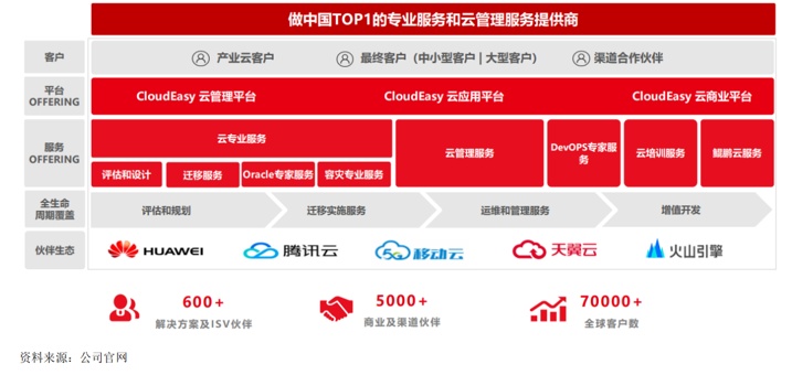 凭借全栈的云服务管理能力,中软国际持续深化与华为云、移动云、天翼云等企业合作,和华为云同舟共济合作五年来,中软国际实现了华为云合作规模增长30倍,同时还与中国移动基于“9 One平台”达成首次联创,为中移物联网提供基于OneNET城市物联网平台一体化交付服务。当前中软国际已汇聚600+的解决方案及ISV伙伴,5000+的商业渠道伙伴,70000+全球客户。