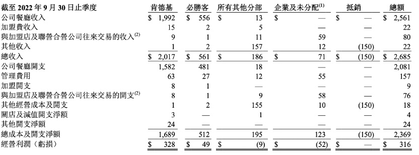 今年三季度,公司收入26.85亿美元,其中餐厅收入25.61亿美元,同比增长11%,收入占比95.38%,另外还有部分加盟费及其他收入,加盟费1.24亿美元,同比减少49%,贡献较低。分品牌看,报告期内肯德基和必胜客收入增速分别为12%和2%,收入占比分别为75.1%及20.9%,合计贡献96%。
