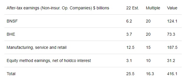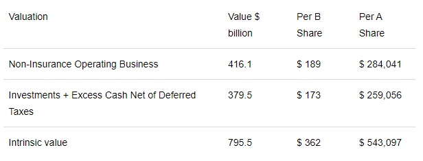 综上所述,分析人士对伯克希尔哈撒韦的累计估值约为7950亿美元,即每股B股价值为362美元,由大致相等的非保险经营业务(189美元/B股)和投资及超额现金(173美元/B股)组成。