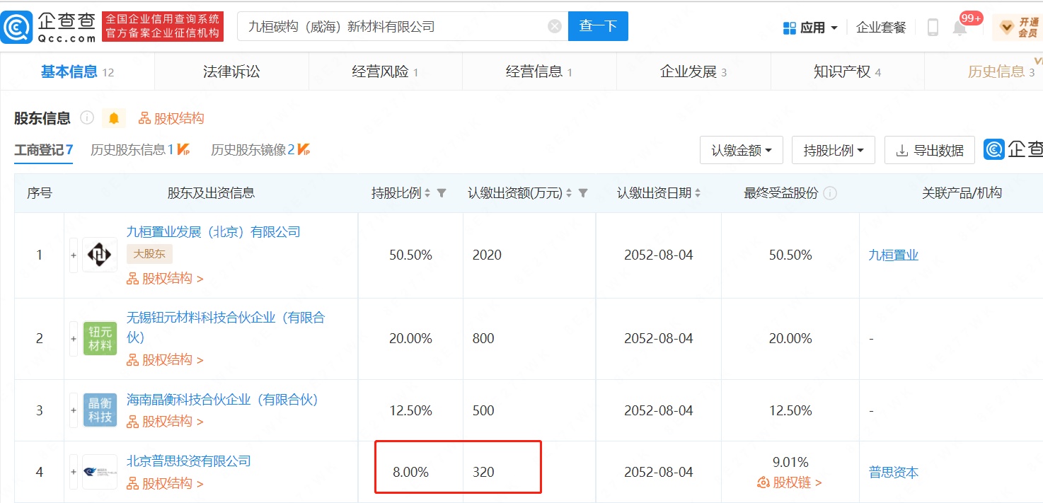 智通财经APP获悉,企查查APP显示,近日,九桓碳构(威海)新材料有限公司(下称:九桓碳构)发生工商变更,新增北京普思投资有限公司(下称:普思资本)、海南晶衡科技合伙企业(有限合伙)、无锡钮元材料科技合伙企业(有限合伙)等多家公司为股东。其中,普思资本认缴出资320万元,持股比例8%。据悉,普思资本由王思聪全资持股并担任法定代表人。