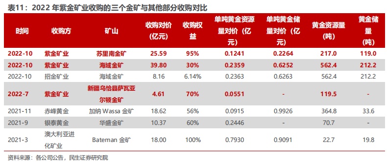 除了对内部矿山的持续挖掘外,近两年紫金矿业还连续出手收购多个具备潜力的金矿项目,以外延式扩张的方式丰富金矿资源量储备。譬如,紫金矿业先后实现四川平武中金银厂金矿、新疆萨瓦亚尔顿金矿70%权益、南美苏里南金矿95%权益、海域金矿30%权益及本次招金矿业20%权益收购,权益黄金资源量大幅培厚,有望较2020年初的1887吨增长约60%,稳居全球主要金企前十位。