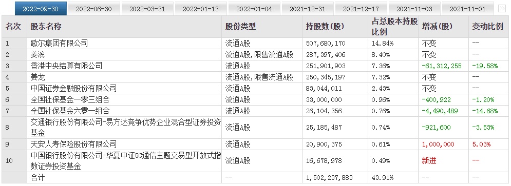 值得注意的是,多家机构在三季度对歌尔股份进行了减持,其中,香港中央结算有限公司和全国社保基金六零一组合减持力度最大,分别为19.58%、14.68%,此外,易方达竞争优势企业和全国社保一零三组合也进行了小幅减持,分别减持了92.16、40.0922万股。中证金融三季度持仓保持不变,险资天安人寿加仓100万股,华夏中证5G则新进前十大股东。