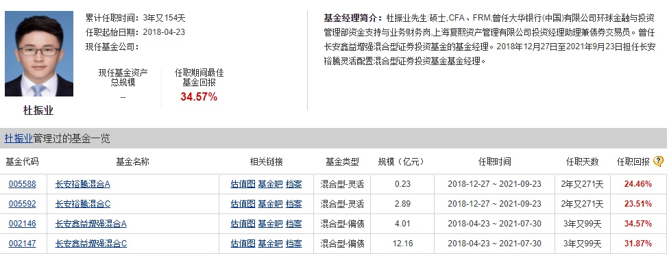 公开资料显示,杜振业是CFA、FRM,曾任大华银行(中国)有限公司环球金融与投资管理部资金支持与业务财务岗,上海复熙资产管理有限公司投资经理助理兼债券交易员。2018年他加入长安基金,后逐步开始管理公募基金。