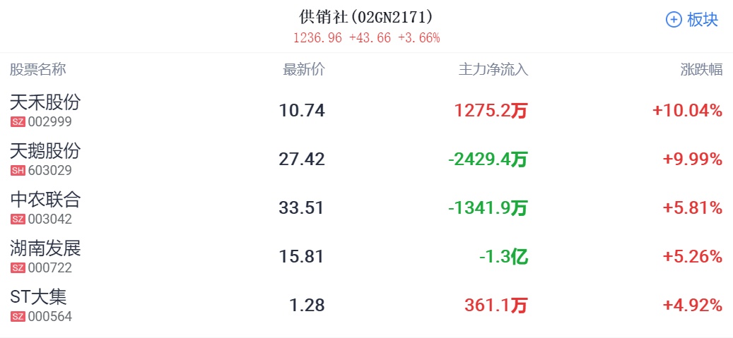 供销社板块继续走高,天鹅股份再度涨停9连板,天禾股份一字板,星光农机3连板,湖南发展、浙农股份等继续冲高。