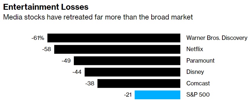 智通财经APP获悉,迪士尼(DIS.US)刚刚遭遇了21年来最严重的单日暴跌,迪士尼周三下跌13%,为2001年9月17日以来最大单日跌幅。与此同时,Warner Bros. Discovery(WBD.US)、狮门娱乐(LGF.A.US)和AMC院线(AMC.US)股价均跌至10美元以下。派拉蒙环球(PARA.US)今年市值已缩水一半。