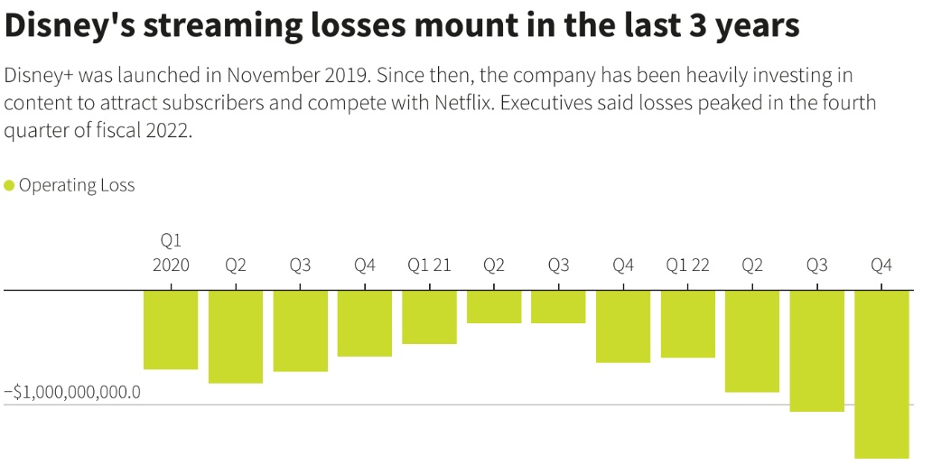 迪士尼的第四财季销售额为202亿美元,比分析师的预期低了约10亿美元。不包括某些项目的每股收益降至0.3美元,低于彭博社调查分析师平均预期的0.51美元。不过,迪士尼本周告诉投资者,其流媒体业务的亏损已经见顶。