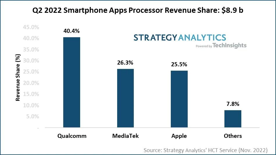 高通以40%的营收份额在智能手机应用处理器市场保持领先地位,其次是联发科(26%)和苹果(25.5%)。