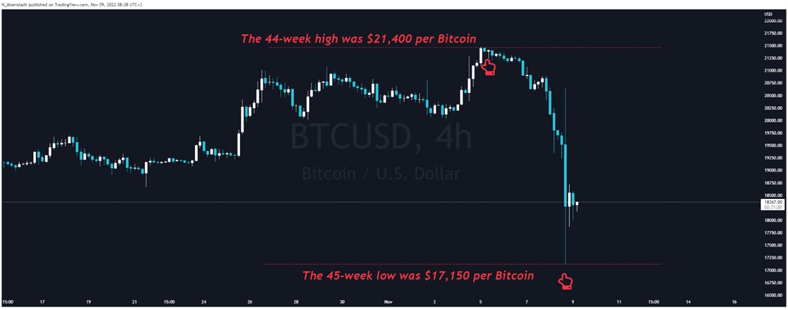 经过一段时间的低波动后,由于最近FTX危机,比特币的价格从2.14万美元大幅下跌至1.715万美元,目前在1.81万-1.85万美元的狭窄价格区间内交易,之后略有回升。比特币跌破每比特币2万美元的心理阈值的关键原因是美联储连续第四次加息,利率水平创下了16年历史新高。