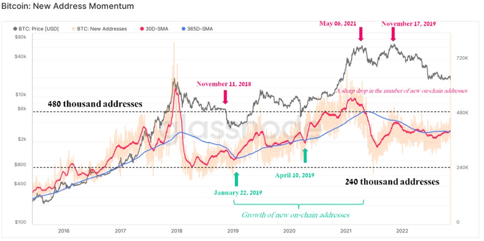 跟踪和建模加密货币市场趋势变化和比特币用户情绪的最有效工具之一是对链上活动的分析。新链上地址的动态从2021年5月达到的多年高点继续下降,当时大规模的投资热潮席卷了几乎所有市场,新的市场参与者打开钱包,投资“数字黄金”——比特币。然而,即使在那时,也出现了人们对比特币兴趣下降的第一个信号,新地址的月平均率跌破了365天简单移动平均线。