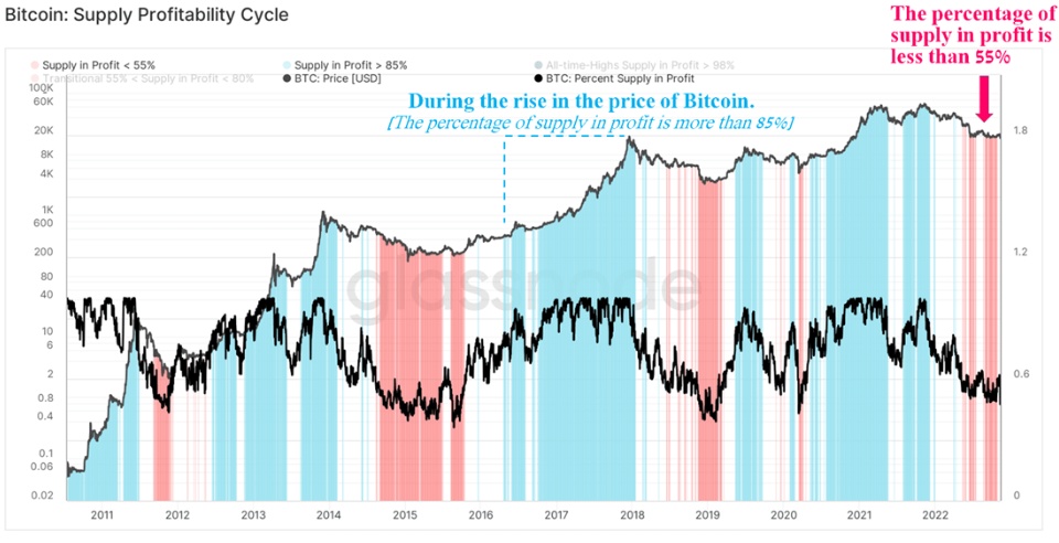 由于投资收益大幅下降,加密货币市场参与者在一段时间内无动于衷,导致比特币的投资者从更冲动的投机者过渡到那些理解加密货币价值的人。这些趋势可以通过比特币供应量获利中百分比(Percent Supply In Profit)进行分析,它提供了有关市场周期状态的信息。目前,该指标继续处于下降趋势,因此,加密货币市场的看跌情绪保持了下来。