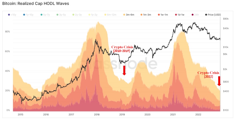 尽管人们对加密货币的兴趣和信心有所下降,但长期投资者并没有失去对比特币未来的乐观情绪,并继续囤积比特币。比特币持有的美元财富中,过去六个月没有变动的份额已经触及多年来的低点。在之前的比特币周期中,这种极低的价值是主要加密货币底部形成的标志,在Aisenstadt看来,类似的情况将在2022-2023年重演。