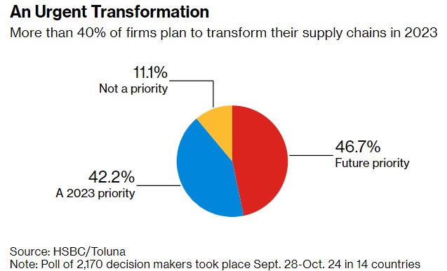 在汇丰控股的调查中,只有11%的受访者表示,供应链转型不是明年的优先事项,但42%的受访者计划这样做,近47%的受访者认为这是未来某个阶段的优先事项。汇丰控股表示,该调查由研究公司Toluna在9月28日至10月24日期间进行,共覆盖了14个国家的2170名中型企业高管。