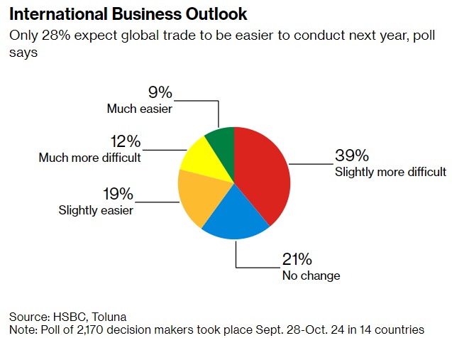 调查还显示,人们的担忧不仅仅局限于供应链,51%的受访者表示,他们预计明年的国际贸易环境将更加艰难。这与世界贸易组织(WTO)对跨境贸易明年仅增长1%的最新预测相符,而今年预计跨境贸易将增长3.5%。