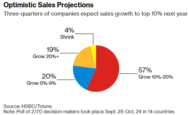 不过,调查显示,总体而言,企业对未来一年的营收前景相当乐观。超过四分之三的受访者预计明年的销售额增幅将超过10%,其中19%的受访者预计增幅将超过20%。