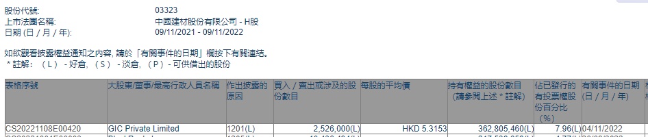 Limited减持中国建材(03323)252.6万股,每股作价5.3153港元,总金额约为1342.64万港元。减持后最新持股数目约为3.63亿股,最新持股比例为7.96%。