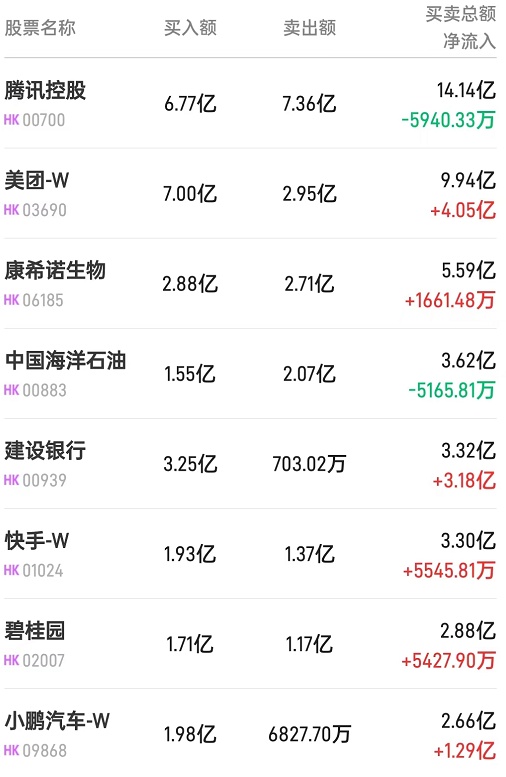 美团-W(03690)、腾讯(00700)、快手-W(01024)分别获净买入3.23亿、1.24亿、1558万港元。消息面上,天风证券指出,历经前期大幅波动后,当前市场环境对于潜在催化剂的反应相对敏感。我们维持观点:外部环境整体呈现改善态势,中国科技互联网企业估值处于历史相对低位,基本面修复趋势较明确,中期估值性价比较高。短期市场交易情绪回暖,重点关注影响企业收入加速拐点的宏观前置指标、以及市场流动性/风险偏好的影响因素。