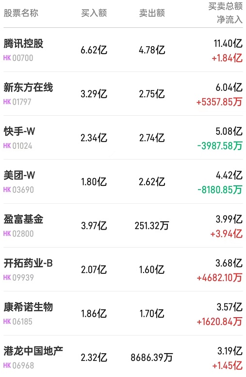 新东方在线(01797)获净买入5357万港元。消息面上,招商证券表示,随着新东方的业绩发布,新东方在线的业绩和毛利率或显著超出预期,未来市值空间仍然巨大,另外双11 的到来有望带动东方甄选的GMV 再创新高。此外,随着新东方在线跟各地的合作助农频率加快,该行认为新东方在线未来有望迎来新的发展阶段,短期继续强烈推荐。