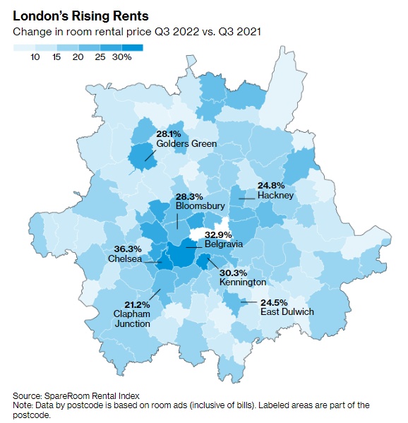 就业网站Indeed表示,英国工人们似乎不那么渴望来伦敦了。首都以外的人在伦敦找工作的搜索量比2019年下降了三分之一以上。一个主要原因是住房成本,根据SpareRoom的数据,住房成本同比上涨了18%。该公司的数据显示,在伦敦的南肯辛顿,现在租一套合租公寓的一间房平均每月要花费1400英镑。